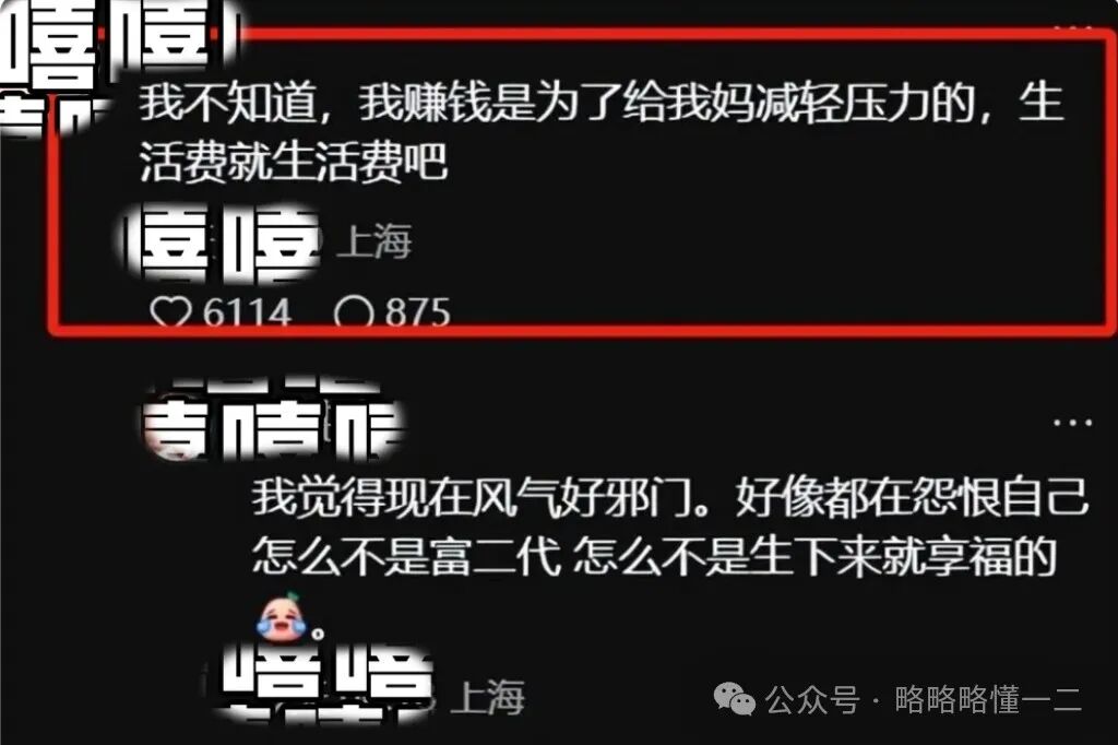 这位网友的评论更加现实,网友说现在的社会风气就有些不太对,很多孩子都在埋怨自己,为什么不是富二代,生下来就是享福的。