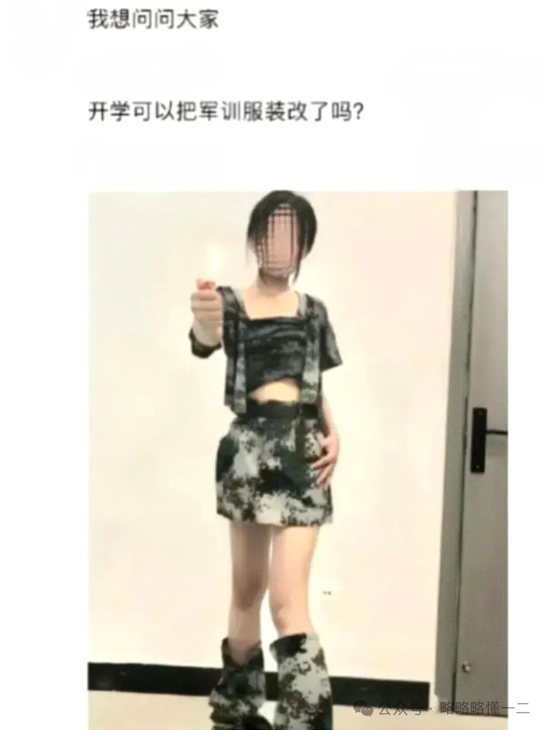 在没开学前,就有女生在群里问可不可以把军训服改了,还用天真无辜的语气说开学能不能穿成这样去,能不能穿去军训,想必大家心知肚明了吧!
