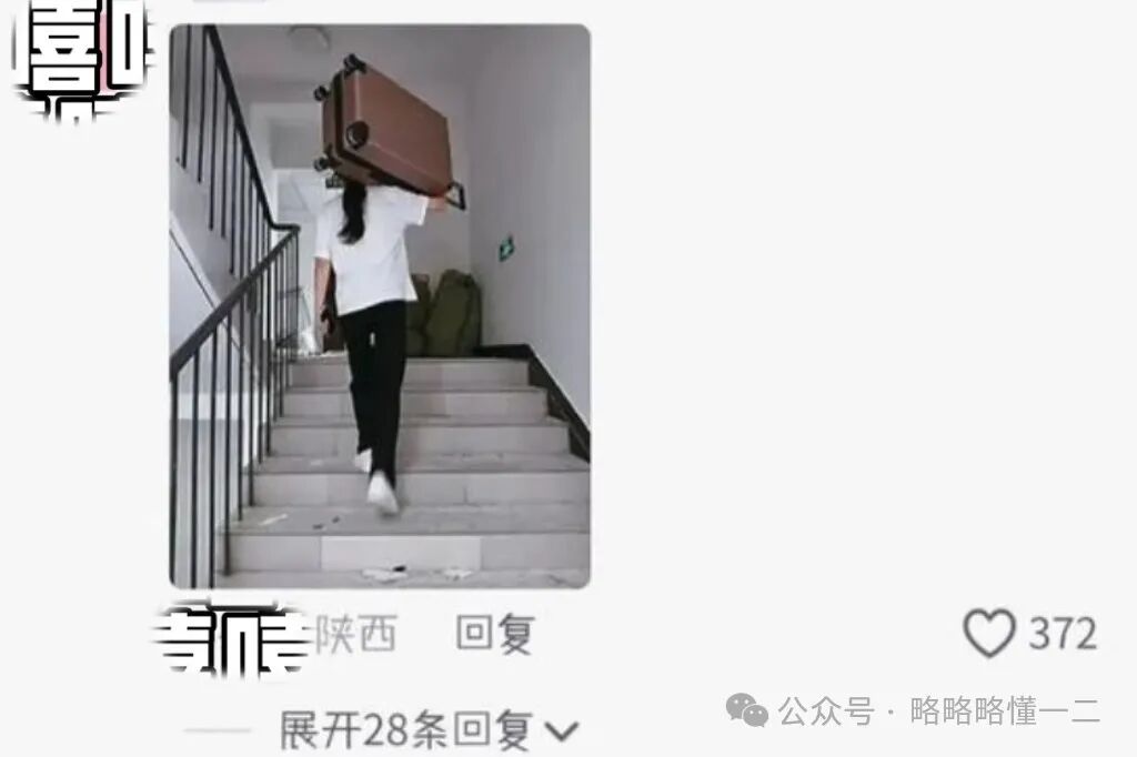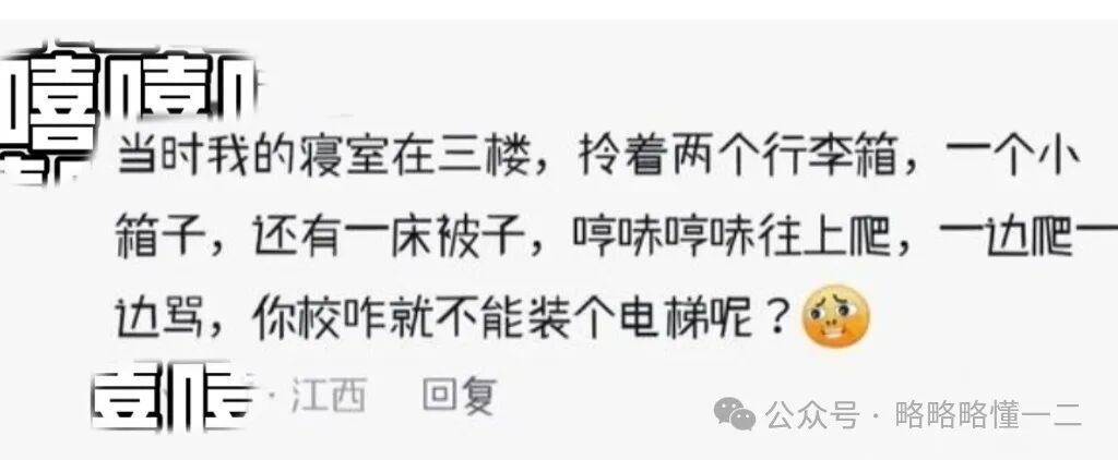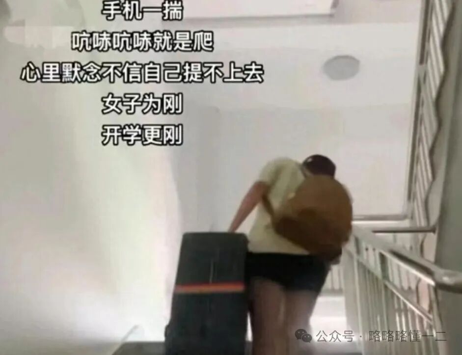 大学生说自己的寝室在三楼,拎着两个行李箱,一个小箱子,还有一床被子,一边爬一边骂学校,为啥不能给安一个电梯呢?