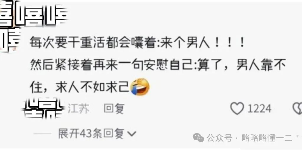 还有的姐妹在每次干重活的时候都会嘟嘟囔囔说来个男人,但紧接着又冷静下来了,男人不可靠,求人不如求己,这一生要强的中国女人。