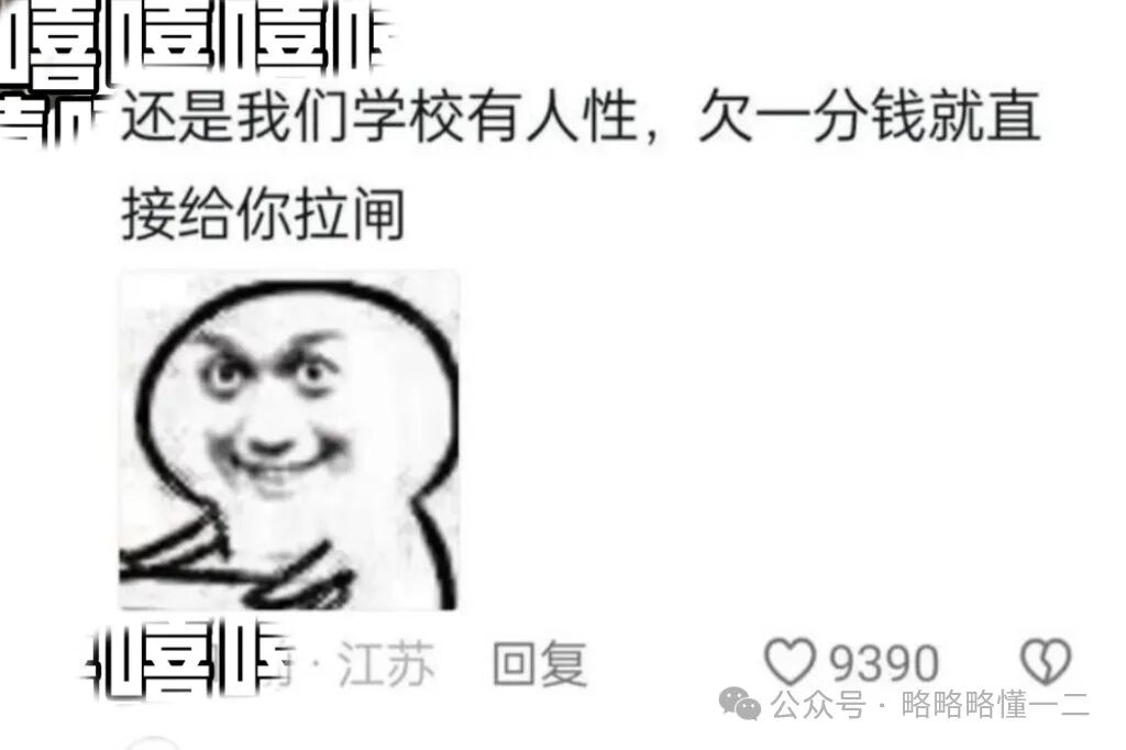 还有学校会在学生放假后自动断水断电,这是合理的制度,避免这种行为,同时也能防止意外发生。回想笑笑当年上学的寝室也很有意思,只要欠费1分钟都得给你停电。