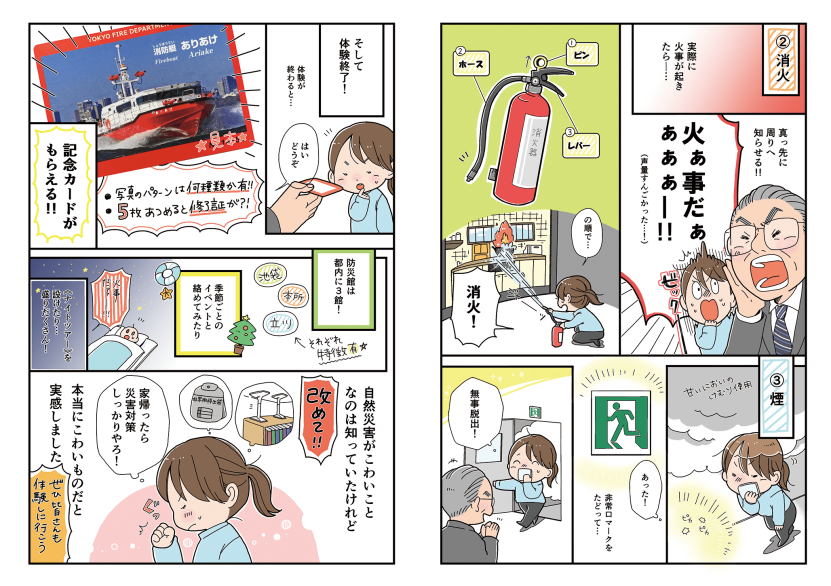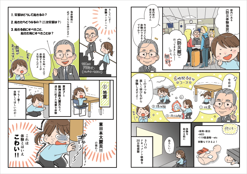 “防災館(都民防災教育センター)は、都民の皆さんの安全な暮らしを目指し、楽しみながら地震の揺れの体験、初期消火や応急救護、火災の煙からの避難要領など、防災に関する知識や技術を学んでいただく体験施設です。”