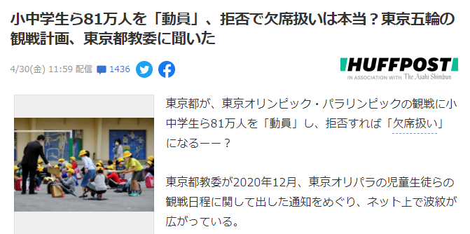 说是东京奥运会缺观众,怎么办呢,就琢磨让东京都的81万中小学生来观赛,而且如果不去还算旷课。原本这个计划去年12月就在网上有消息。