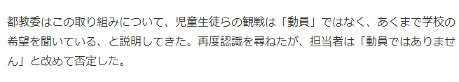 最后该媒体记者向东京教委证实该消息时,东京教委表示并不是动员学生参加,目前只是询问学校的意见。而当记者再次询问时,担当人员明确否认了动员一事。