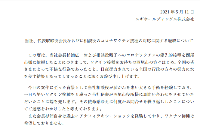 不过神转折是,スギ控股集团发布了一封道歉信,表示会长夫妇从来就没有要求接种过,这一切都是秘书自己的行为。