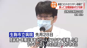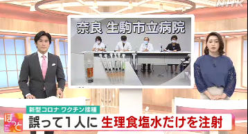 奈良县生駒市的市立医院上个月给高龄人群接种疫苗的时候,误将生理盐水当作疫苗注射给了一名接种者。