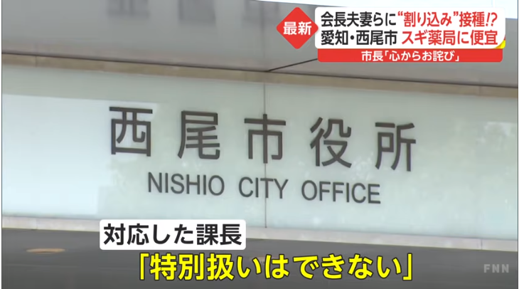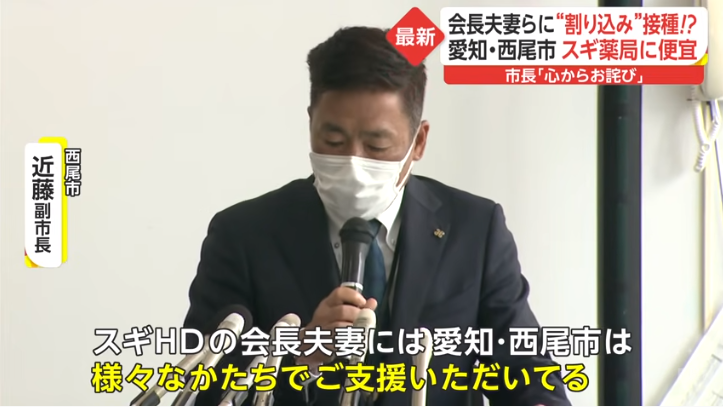 在5月11日,西尾市市长在记者会上鞠躬道歉,表示深刻反省此事,同时副市长表示スギ控股集团一直给本市贡献了很多,一直想给与报答,才迫于此答应的,已经取消了该夫妇的接种预约,之后会按照规定执行。