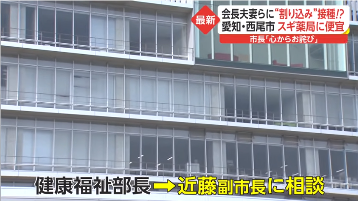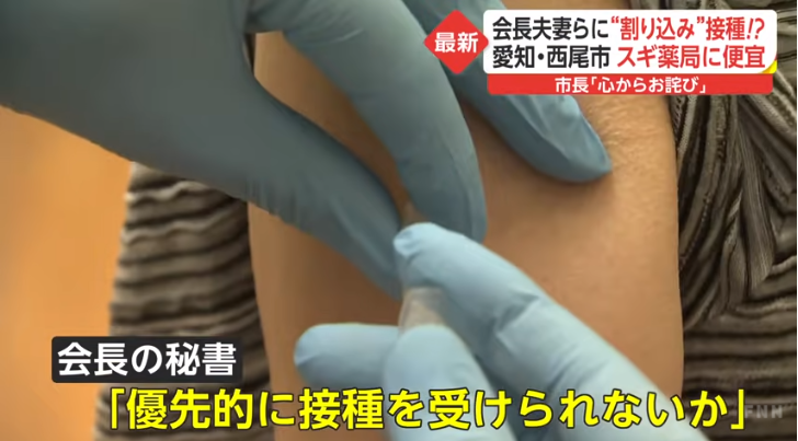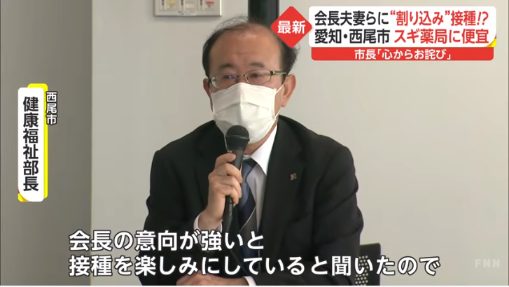 4月12日刚刚接到疫苗的爱知县西尾市接到了市内大型公司スギ控股集团的女秘书电话,要求给公司创始人会长夫妇预约4月19日的疫苗接种。