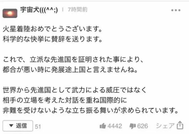 2021年5月15日,中国无人探测机“天问一号”在火星着陆。这一消息不仅让国人振奋,更让世界震惊。作为我国只要屁大点事儿就要拿着大喇叭到处喊的国家之一,日本也报道了此事。