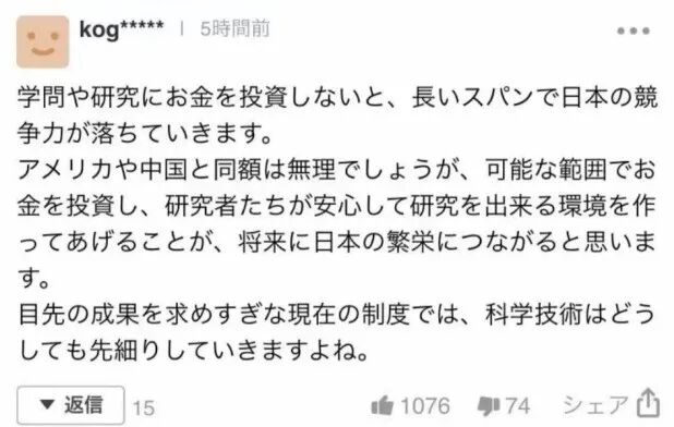 这位网友认为:将来日本的繁荣与科研息息相关,而随着国家在科研方面的投入减少,日本在世界中的竞争力也在减弱。