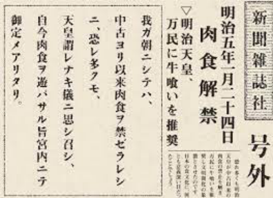 我们先从最近的历史讲起。在『明治天皇纪』中大概有以下记述:天皇最初尝试西洋料理是在1872年1月1日。在同年1月26日,天皇吃到人生当中第一口肉后,正式宣布全国解除“肉食禁令”。