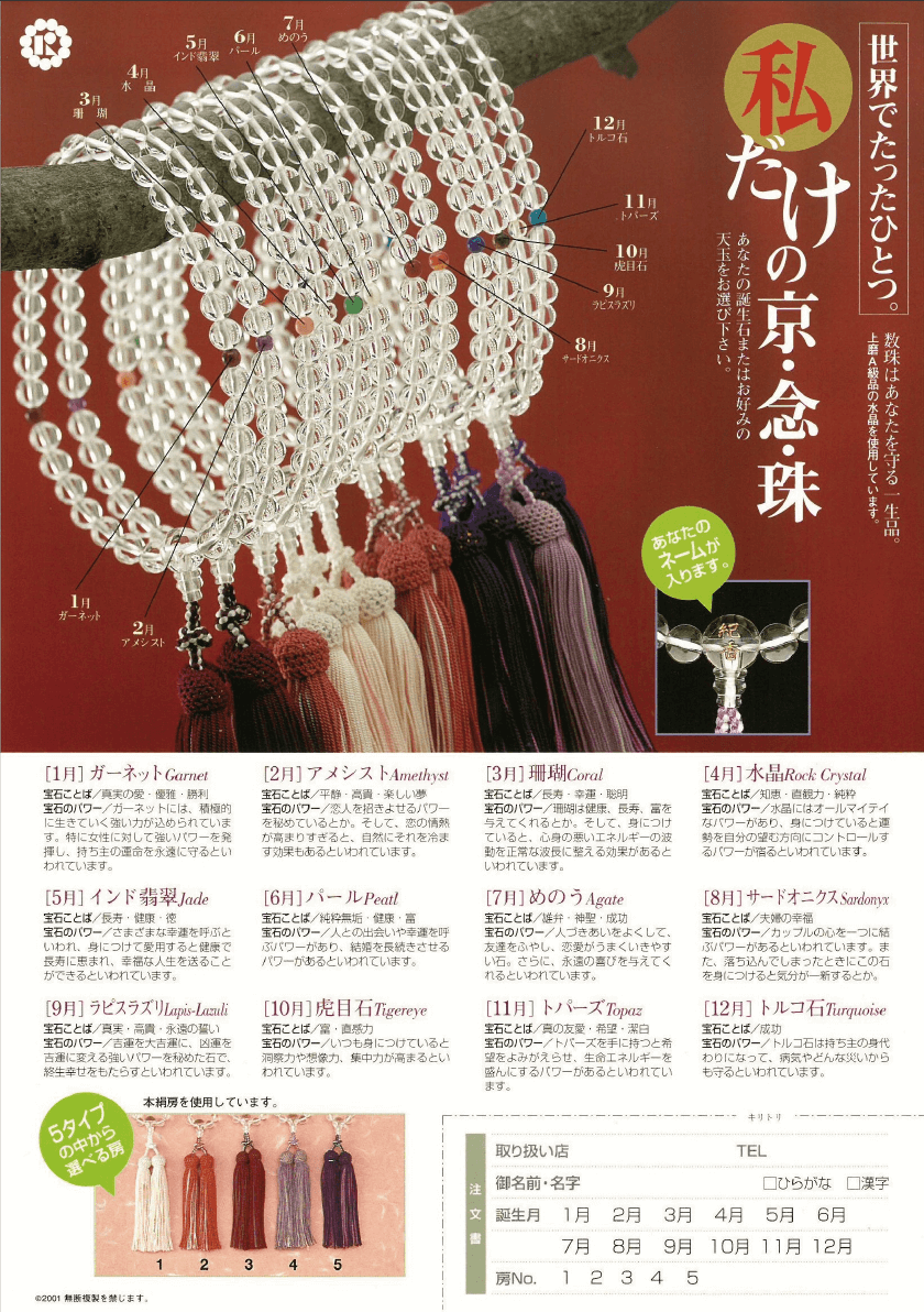 神户珠数店创业于大正7年(西历1918年),距今已经有103年的历史。佛珠作为“寺庙和尚和教徒重要的器具”、“成人时或者嫁人时父母对孩子深切的祈愿”而存在,神户珠数店是其中重要一环。店铺主打的佛珠叫做“京念珠”。