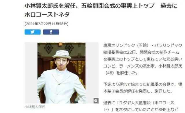 而昨天早上,开闭幕式节目导演小林贤太郎因曾参与制作模仿犹太人大屠杀视频,被东京奥组委解雇,突如其来的“惊喜”,给360度无死角混乱的东京奥运会又添了乱,