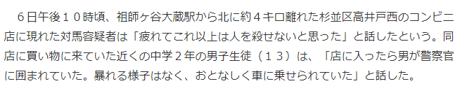 当晚10点左右,在日本杉并区的一家便利店进来了一名男子,该男子对店员说“电视里说的这个犯人就是我”随后店员报警该男子很老实地跟着警方上了警车。