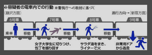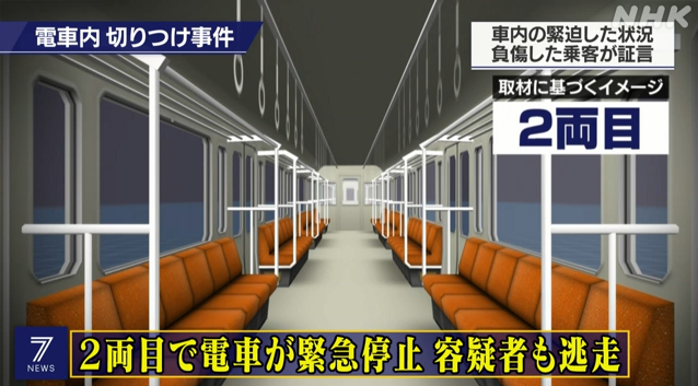 当时作案男子从6号车厢上车后讯速向前方的7号车厢移动,当电车行至到成城学园这站附近时,该名男子突然从包中掏出一把刀划向了一名正在座位上的女大学生。