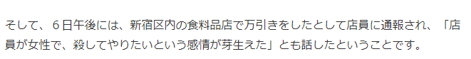 据本人交代,当天下午他在东京新宿的一家食品店中偷东西,被女店员报警了,这件事让他记恨在心就萌生了想杀女人的想法。