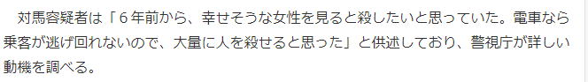而早在6年前,他就有过想要杀那些看上去很幸福的女性的想法,想着电车的话没办法跑出去,就能杀到更多的人。