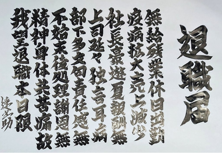 退職届無給残業休日出勤疫病拡大売上減少社長豪遊夏報酬無上司延々独言耳痛部下多文句責任感無不始末後処理謝思無精神身体共苦痛故我望退職本日限