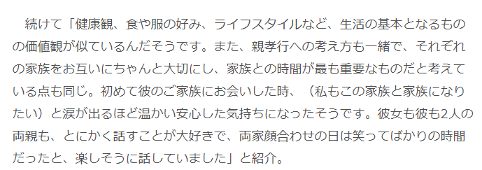 此外两人的健康观、衣食住行也有相似的价值观,也都很孝顺,认为陪伴家人的时间是最重要的。双方家长也都是爱聊到一起的。