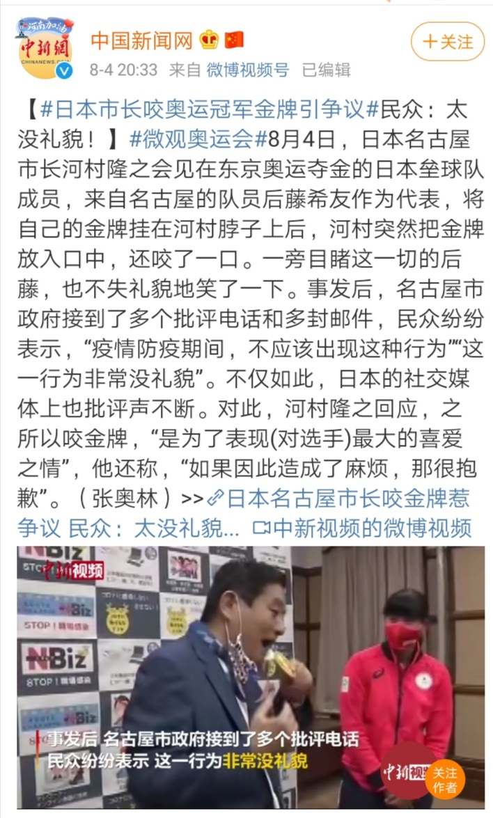 不知道大家有没有关注,早前日本名古屋市长让广大网友口诛笔伐的事件呢,也就是在8月4日日本名古屋市长河村隆之会见在东京奥运会夺金的日本垒球队成员,其中作为代表队员的后藤希友将自己的金牌挂在河村脖子上后,河村突然摘下口罩咬了一口。