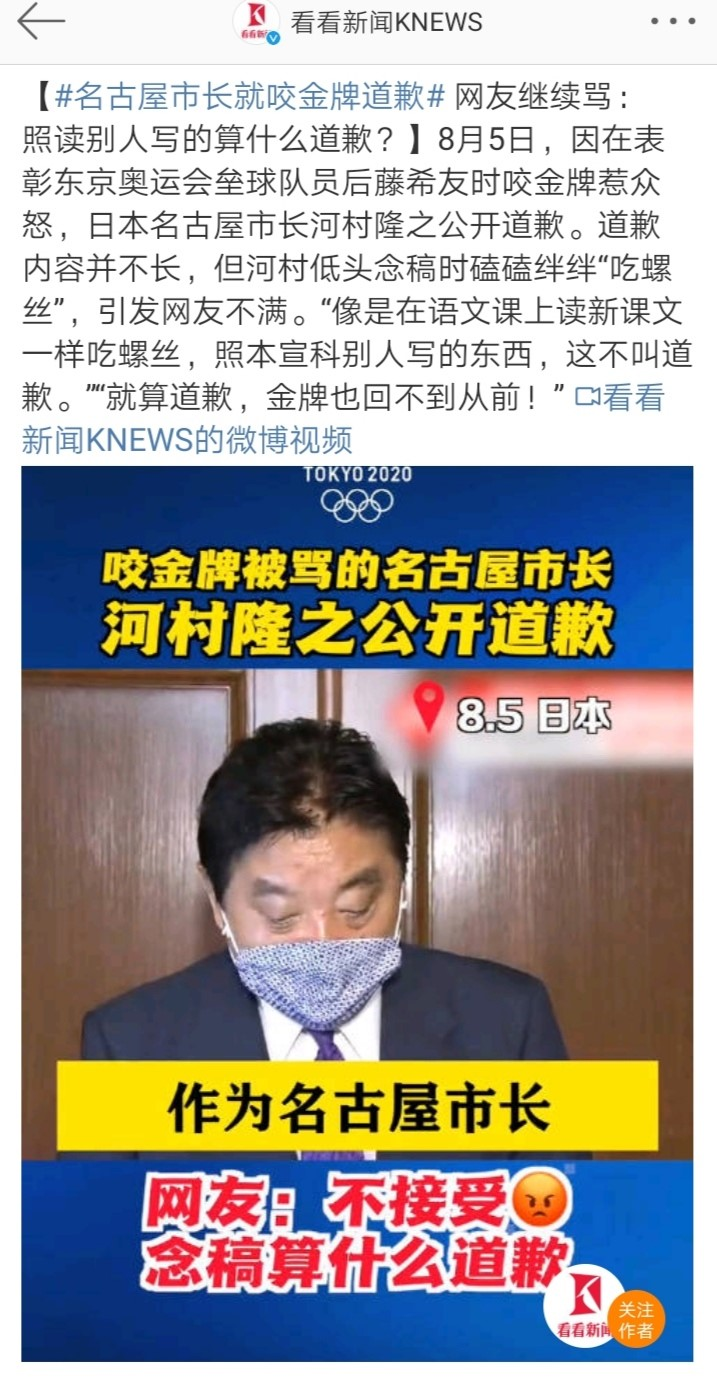 事发后引起广大网友的不满和热议,河村也在第一时间公开道歉,但念稿式的道歉被网友评论过于“敷衍”,不接受道歉。