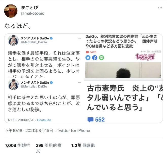 可惜的是,从被人欺负的弱者里强大起来的DaiGo,不仅没有对弱者产生同理心,相反还加入了欺负的那一方。