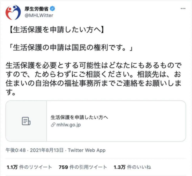 厚生劳动省也在这个微妙的时间点发推表示:“申请生活补助是国民的权利。”