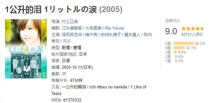 《一公升的眼泪》根据患有脊髓小脑变性症的木藤亚也真实故事改编。由泽尻绘里香(泽尻英龙华)、锦户亮主演,讲述了患有不治之症的14岁少女池内亚也,在家人朋友的鼓励下,积极对抗病魔的催泪励志故事。电视剧2005年开播,至今在豆瓣依旧有9.0的高分。