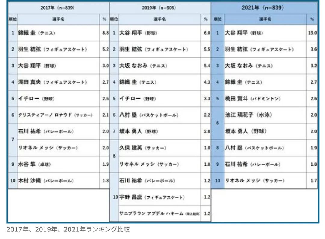 相对于大家所熟悉的羽生结弦,这位职业棒球手被人提及的次数似乎并不多。但在2017年、2019年、2021年的同一榜单中,大谷翔平都力压羽生结弦获得第一名,可见其在日本的受欢迎程度。