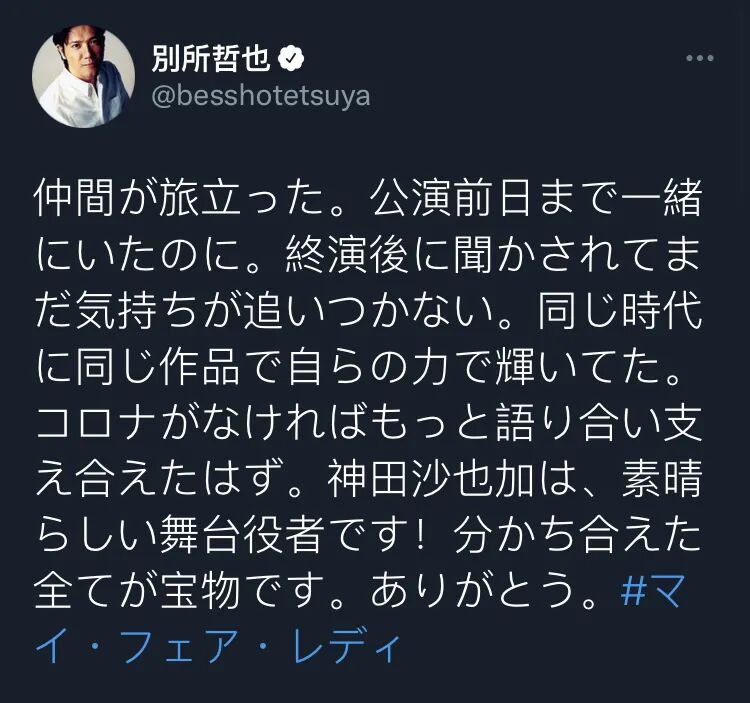 神田沙也加去世的消息传出之后,曾经与她一起工作的演员纷纷发文悼念。与她一起出演音乐剧《MY FAIR LADY》的别所哲也表示“如果没有新冠应该能够更加努力地支持着她,神田沙也加是一个出色的舞台演员!”