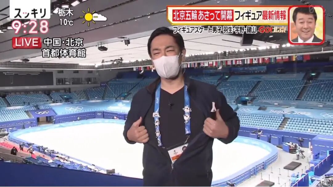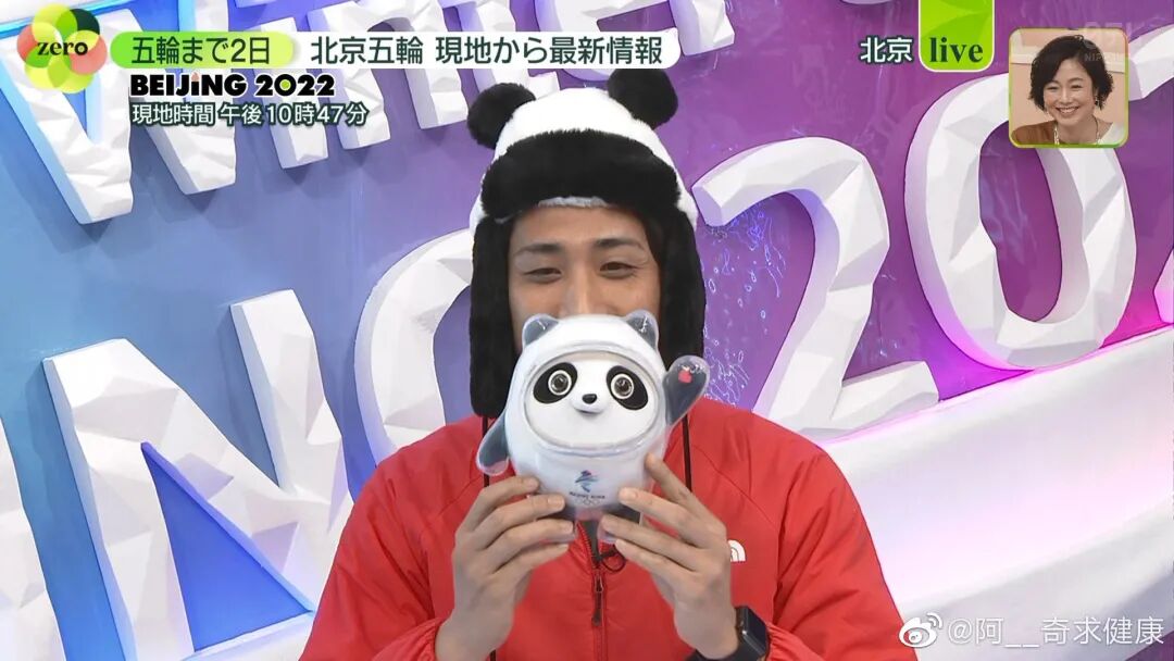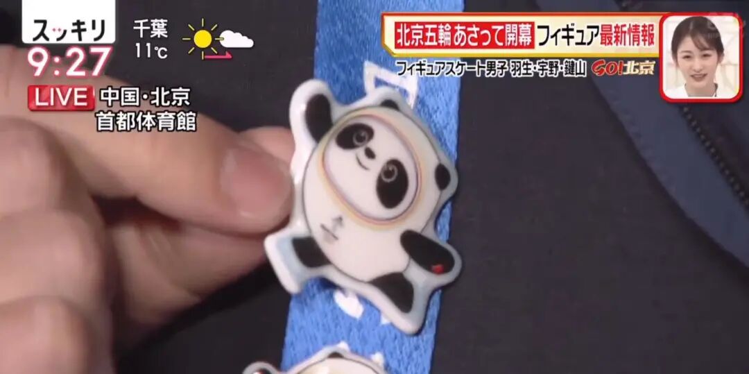 不得不提的就是记者辻岡義堂,主持人问有没有日本相关的花滑情报,辻岡義堂说有今天最新的冰墩墩的新闻。然后拉开拉链开始介绍自己挂在记者证上的冰墩墩花滑形态徽章,因为太喜欢又买了6个,镜头还给了特写!