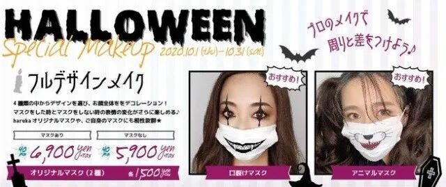 今年,在疫情的影响下,口罩将成这次万圣节妆容之战的大看点!日本化妆沙龙连锁店Atelier Haruka(在东京及日本其他地区设有十几家分店)提供了万圣节化妆的特殊企划——除了提供或冷艳或惊悚的妆容外,商家还特备提供了万圣节主题口罩。