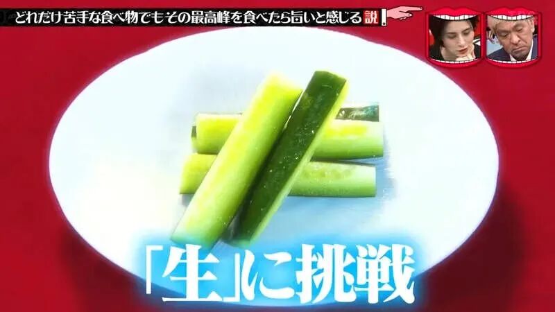 节目组考虑到太田将近30年没吃过一口黄瓜,没有一上来就让他表演生吃,一开始先给他安排了一道腌渍过的沙拉开胃,比起生吃来不管在口感还是形状上都相对温柔。