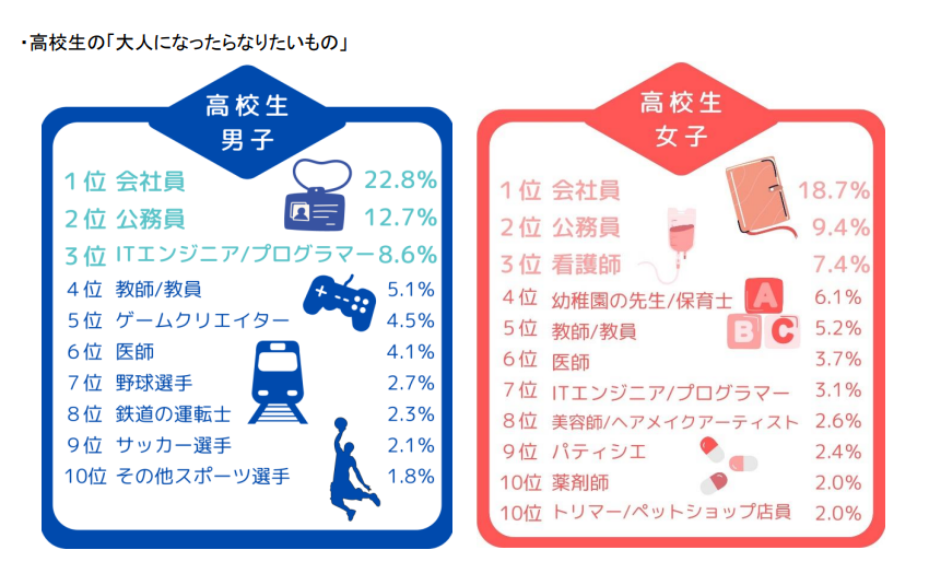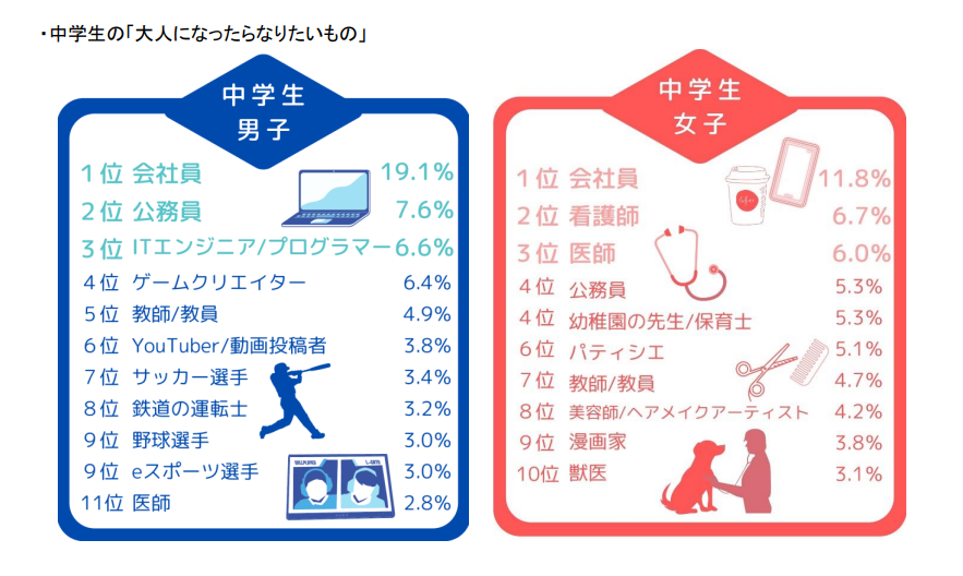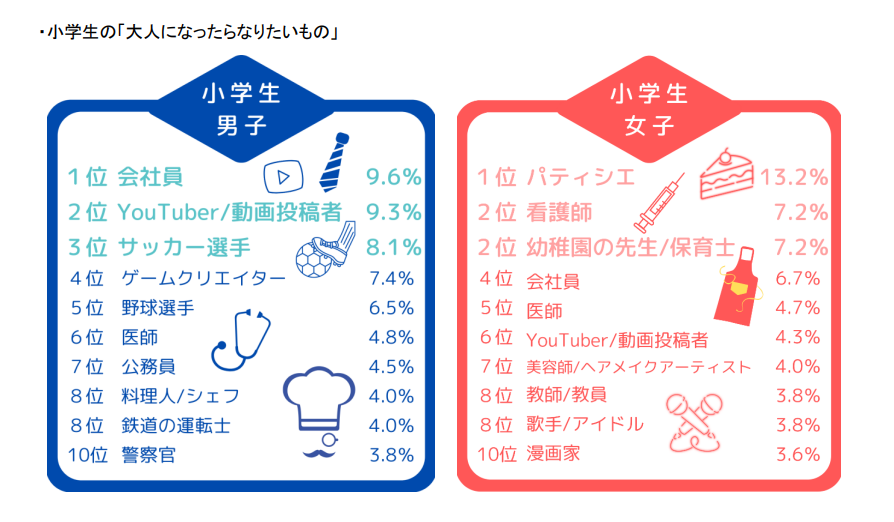 调查显示,小学生中的男生最想做的是公司职员,第二想做的是YouTuber/动画投稿人,而足球选手和棒球选手则位列第三和第五名。之所以想成为足球和棒球选手的原因,是受到日本足球选手保健英以及棒球选手大谷翔平的影响。而女生最想做的是甜点师傅,而去年名列第六位的护士这一职业,在今年名列第二,医师则名列第五。这一结果从侧面说明,通过电视等多种媒体宣传医护人员的工作状态对于孩子们的正向引导是成功的。