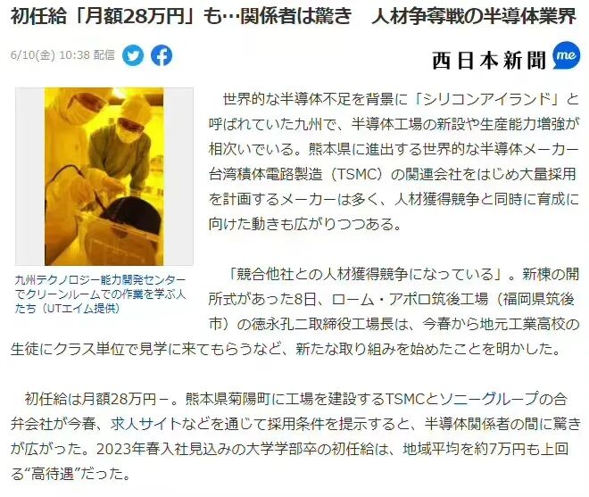 别的不说,就这个28万日元的价格直接把半导体行业的相关人士给弄懵逼了。要知道,日本的本科应届毕业生初入公司的平均工资一般是21万日元左右,台积电每个月多给了7万日元,这在行业当中绝对是妥妥的“高待遇”了。