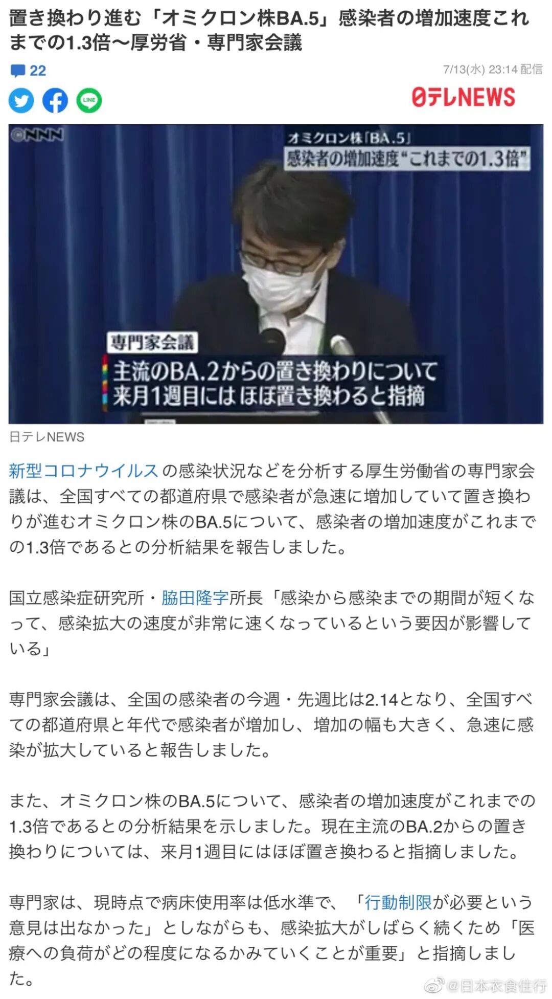 虽然首相大人上周就表示不会限制大家的出行,无非就是旅游补贴会下放地慢了一些,但医学专家们面对如此严峻的形势还是坐不住了,他们根据这段时间的日本新冠增长人数,得出了“奥密克戎毒株BA.5使得日本感染者增速达到了过去的1.3倍”这样的结论。