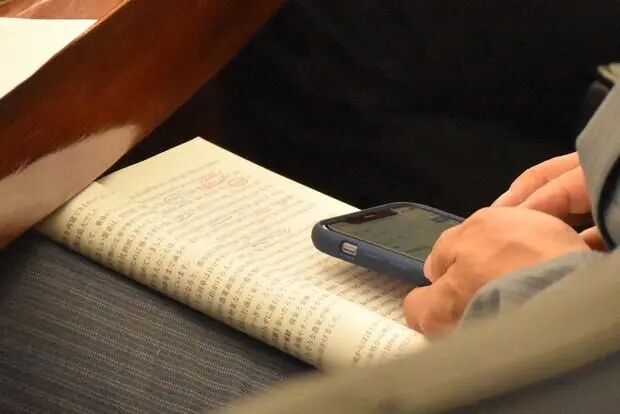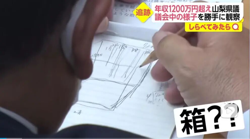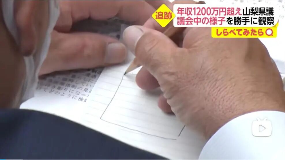 日本记者在山梨县议会中拍到的画面,一位日本议员在开会期间竟然在画草图,打发时间。