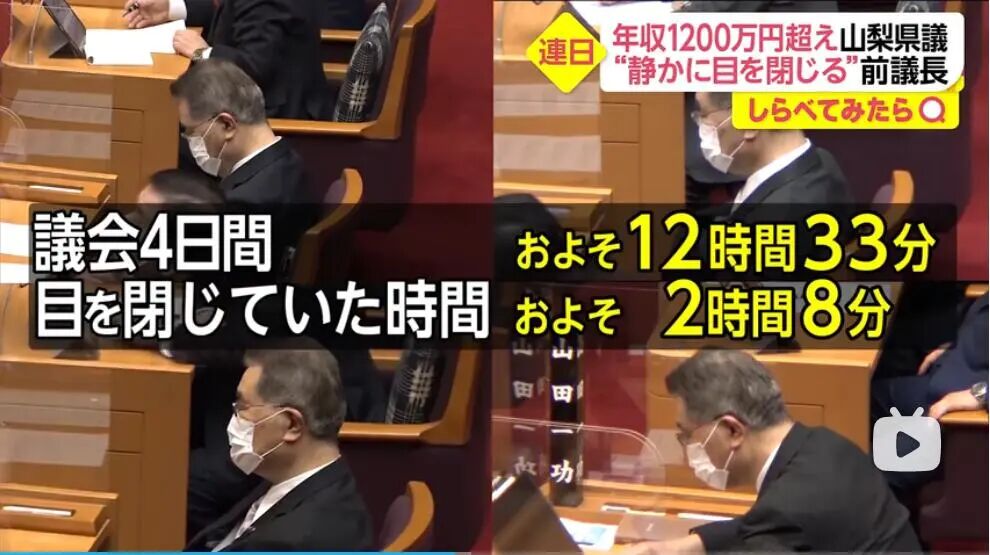 在山梨县议会中有一位议员更是开会4天连睡4天,会议4天大概12小时33分,议员闭目休息大概就有2小时8分,拜登看了视频都直呼“内行”。