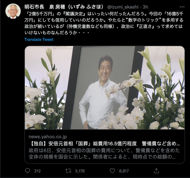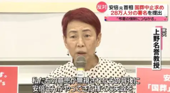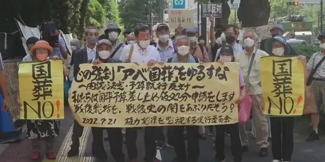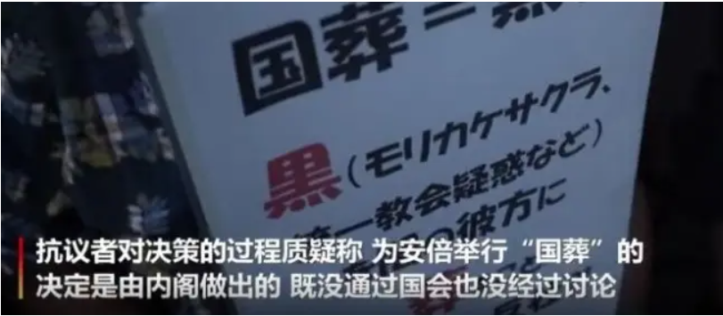 甚至有抗议者对决策的过程质疑,安倍举行“国葬”的决定是由内阁做出的,没有通过国会也没有经过讨论。(毕竟有东京奥运会的前车之鉴,花费巨额举办效果却不尽如人意,很难不让人产生怀疑,如果同意安培举行国葬这一大笔费用又不知有多少是流入谁的口袋里了。)