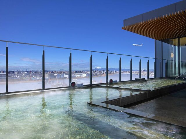 在旅馆顶层设置了2000平方米的温泉区,名为“泉天空之汤 羽田机场”,人们可以边泡温泉边看天空飞过的飞机,甚至还可以看到富士山。不止是在酒店入住的客人,一般人也可以过来享受,而且是二十四小时全天候开放的。
