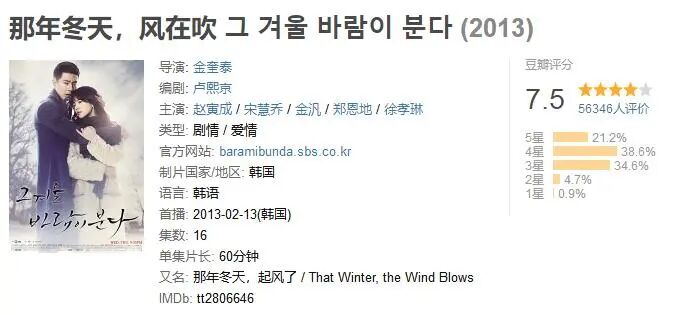 韩版翻拍的《那年冬天风在吹》把故事背景从夏天搬到了冬天,由宋慧乔、赵寅成主演。基本相同的故事情节,让剧播出时就受到了关注。