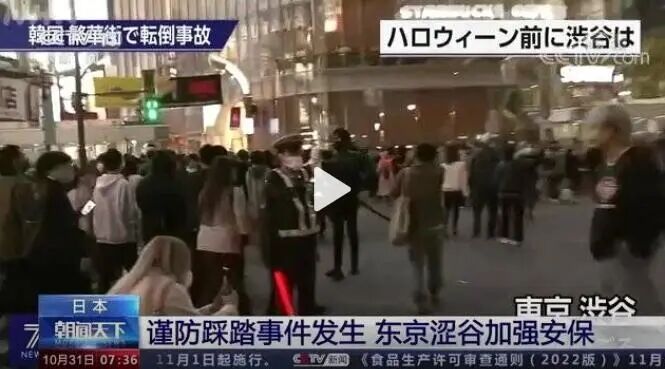 为了防止踩踏事件再发生,日本东京知名商圈涩谷地区也加强了安保,警方出动多名防暴警察引导行人缓慢通过,避免长时间停留导致人流过多拥挤,行人摔倒。