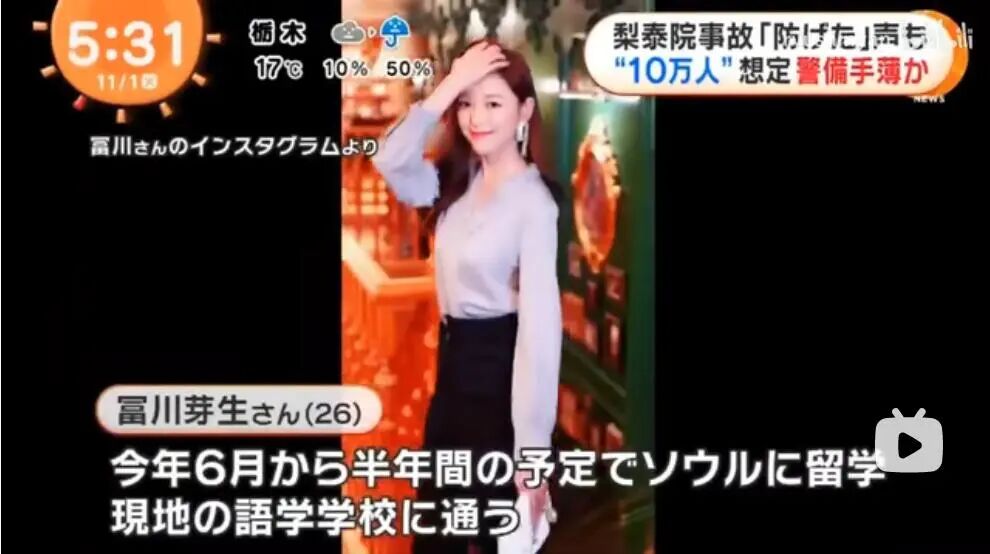 在遇难者中就有一位26岁赴韩留学的日本女生富川芽生。芽生是出生在北海道根室市,她从高中时期起就对韩国产生了浓厚的兴趣,韩国的饮食文化和偶像经济让她产生想去韩国留学的念头,父母也很支持她的想法,在今年六月份正式赴韩留学,距今也才4个多月。