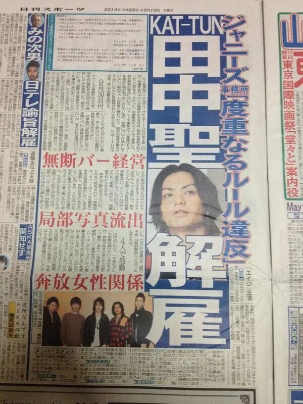 一次又一次无下限的行为,彻底激怒了杰尼斯事务所。2013年9月30日,杰尼斯发表解雇田中圣的声明。他是史上第一个没有明确触犯法律却被炒的J家成员。