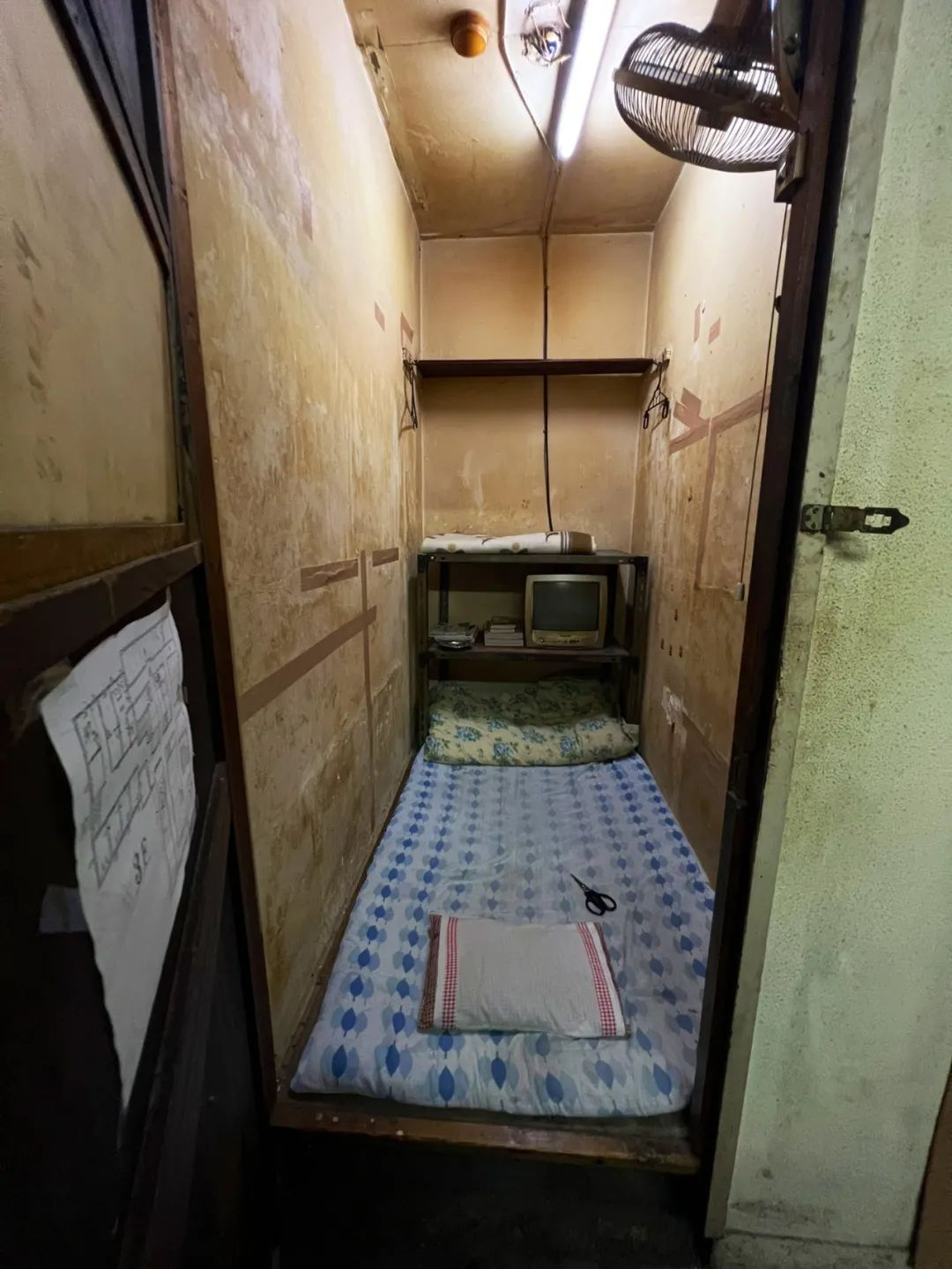 推开门,整个房间尽收眼底。只够一个人平躺的床几乎占据了整个房间,两边墙壁斑驳掉漆,墙上缝缝补补的胶布泛黄脱落,满是时光的印记。床单被套不仅褪色严重,也不知道洗没洗过。