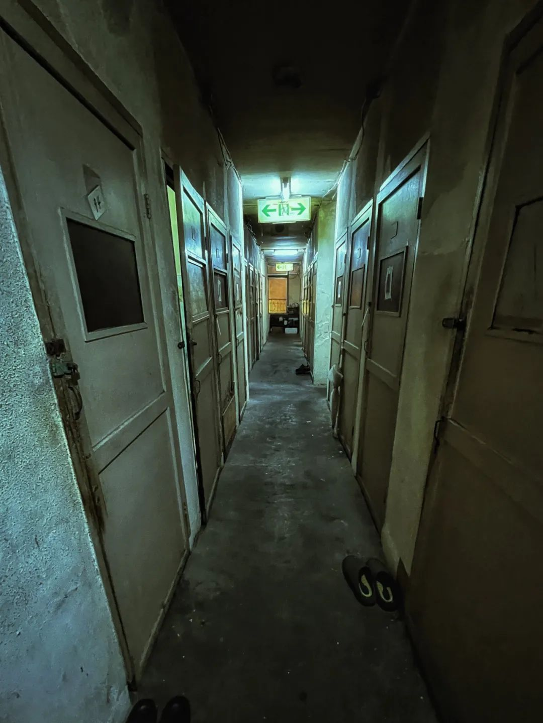 办理入住后,前往房间。狭长幽暗的走廊两边,是褪色破败的房间门和坑坑洼洼掉漆的墙壁,头顶的灯散发着幽森森的绿色,好像荒废了很久的空屋电路故障一样。真的不是什么恐怖片拍摄场地或是剧本杀场景吗?
