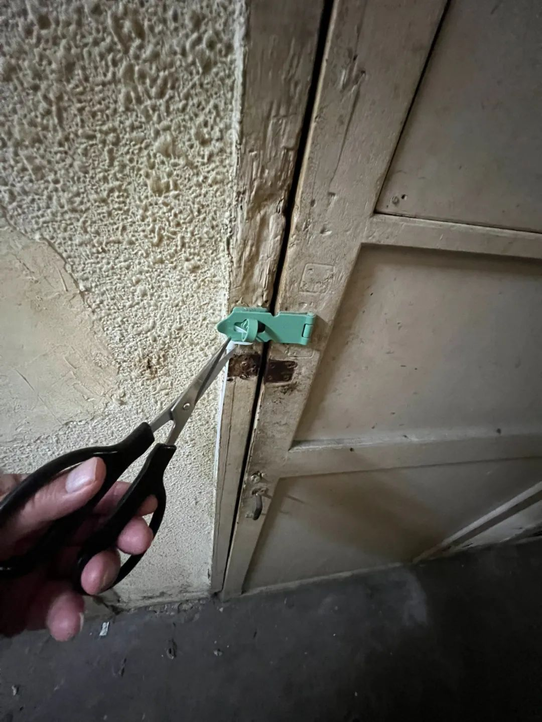 继续往里面走需要勇气。艰难走到了房间门前,好家伙!房门没有锁,只用线绑着,直接拿剪刀剪开就能入住了。