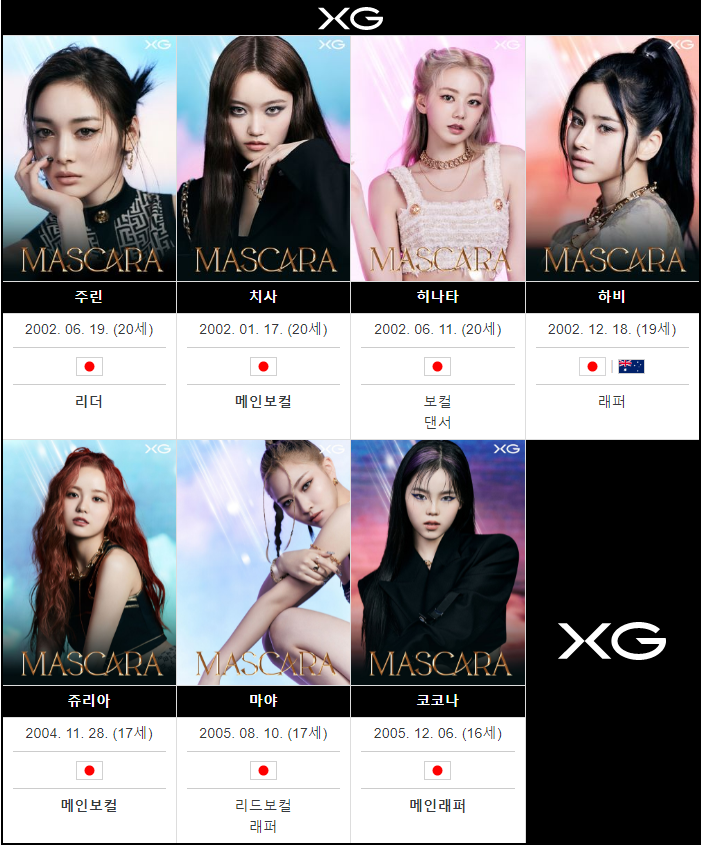 XG由日本知名唱片公司艾回(AVEX)一手打造,筹备五年,聚齐JURIN、CHISA、HINATA、HARVEY、JURIA、MAYA、COCONA7人(人名顺序对应上图),推出的HipHop/R&B女团,2022年3月在韩国正式出道。目前共发布4首单曲。