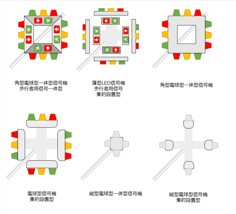 从外表上看,它像一个“口”字,各个面上分别配置红绿黄的车辆用信号灯,内侧的各面则配置着行人用信号灯。从70年代以来,这种信号灯在10年的时间内被设置于宫城县、群马县、爱知县,后来也在高知县、岛根县、广岛县、冈山县、大阪府等地被设置,大部分都是LED型号,可以说在日本的运用范围相当广泛了。
