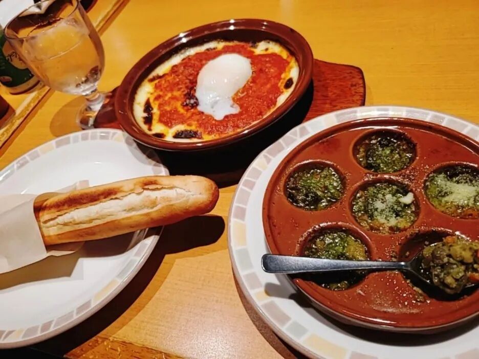 ・エスカルゴのオーブン焼き (烤箱焗蜗牛)(400円)・ミニフィセル(迷你法式面包)(150円)・半熟卵のミラノ風ドリア (米兰式多利亚半熟鸡蛋)(350円)・グラスワイン白 (一杯白葡萄酒)(100円)